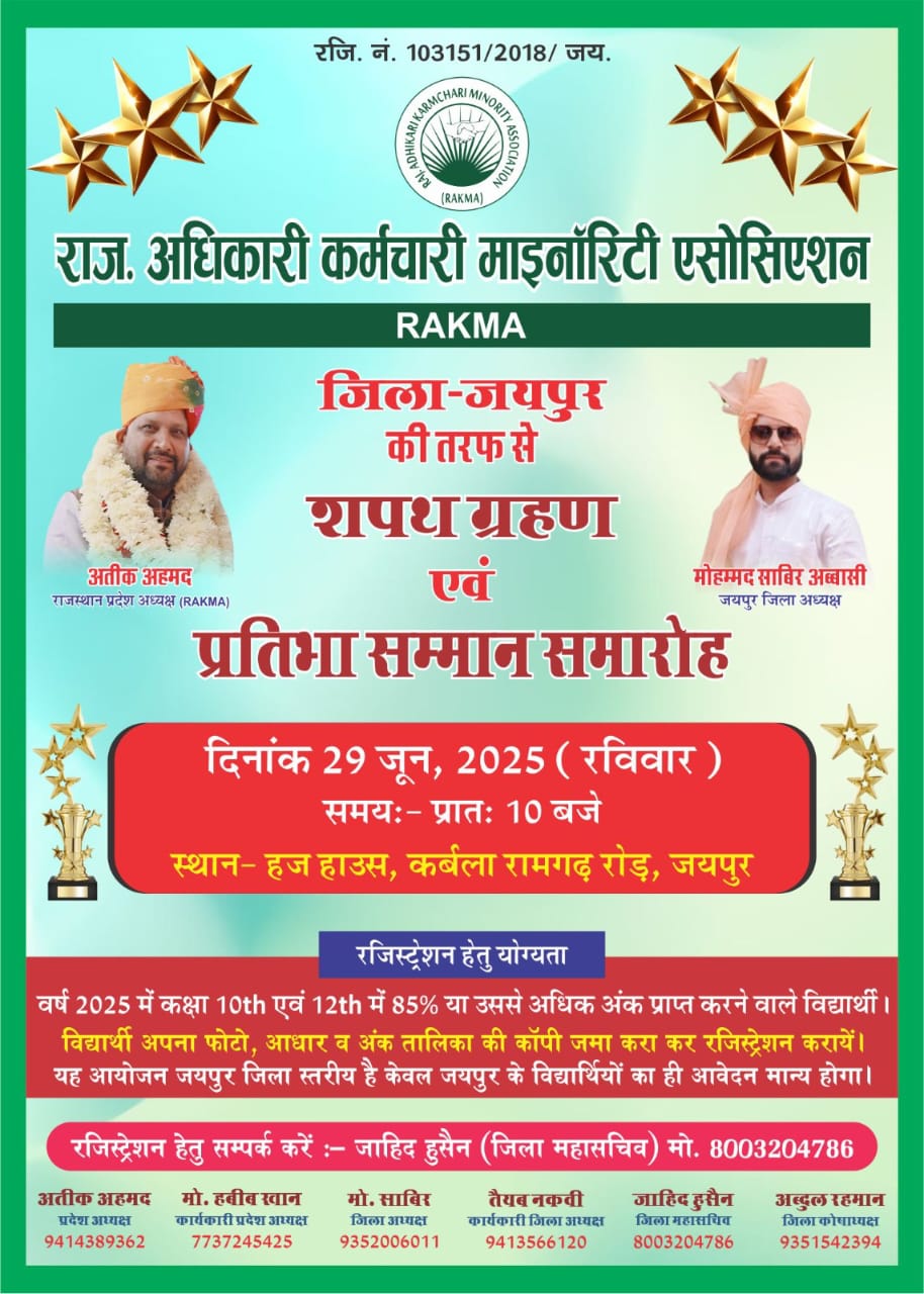रकमा प्रदेश कमेटी एवं जयपुर जिला कार्यकारिणी द्वारा सम्मान समारोह, जयपुर में 25 से 31 दिसम्बर 2025 के दरमियान आयोजित