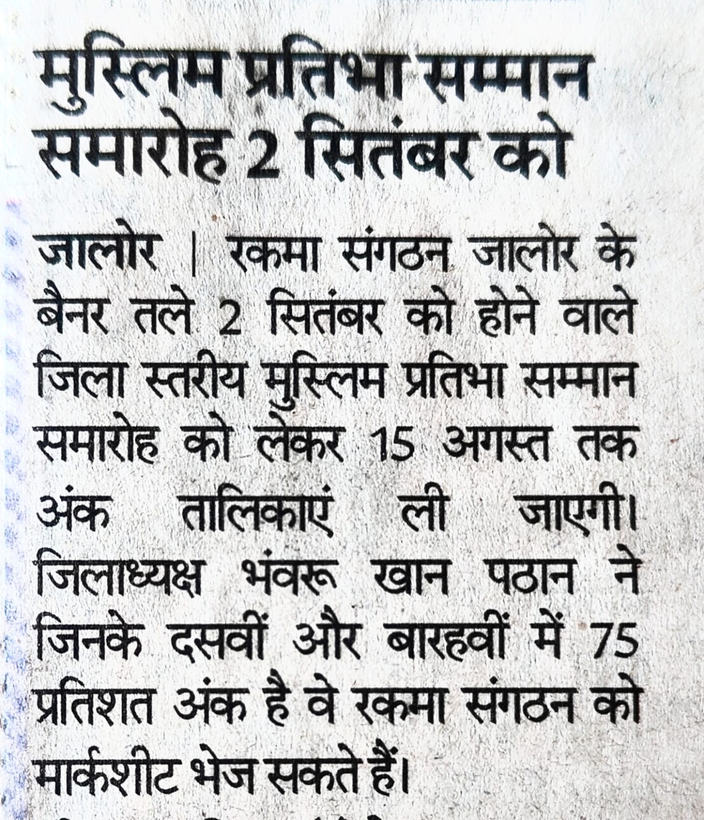 जालोर | रकमा संगठन जालोर के बैनर तले 25 अक्टूबर को होने वाले जिला स्तरीय मुस्लिम प्रतिभा सम्मान समारोह को लेकर 15 अगस्त तक अंक तालिकाएँ ली जाएंगी।